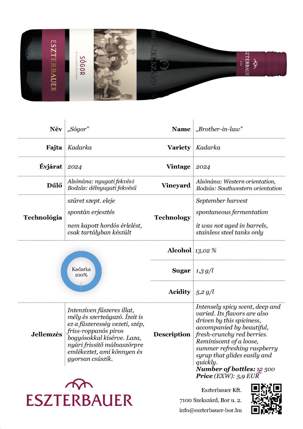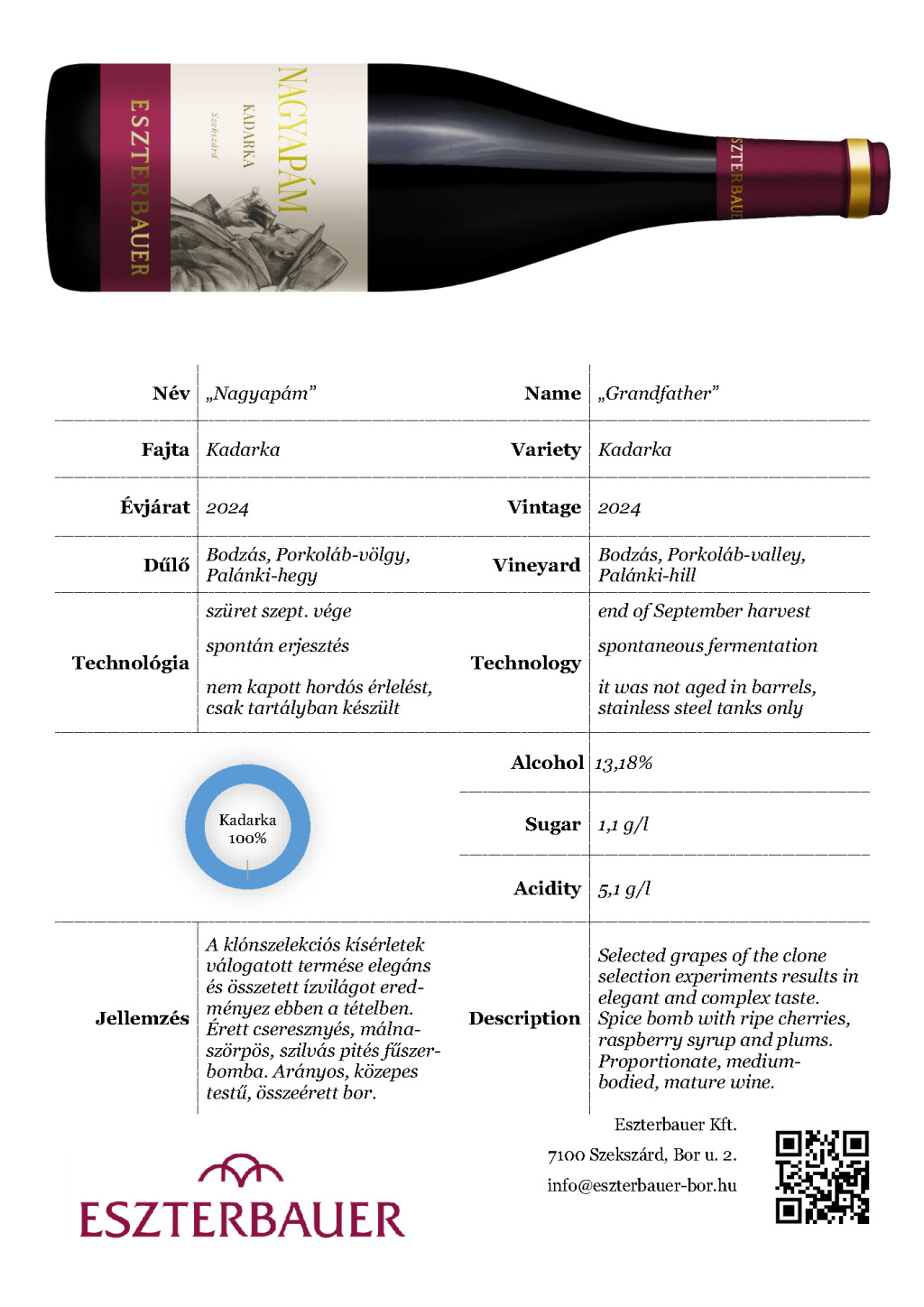 "Nagyapám" Kadarka 2024 – könnyed, gyümölcsös vörösbor, amely a klasszikus kadarka játékosságát és eleganciáját idézi.
