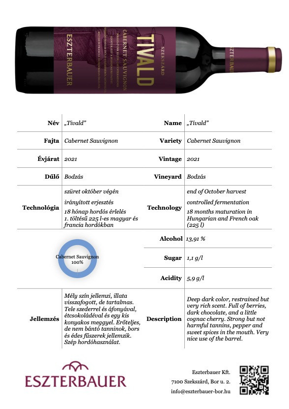 • "Tivald" Cabernet Sauvignon 2021:Mély szín, intenzív fajtajelleges illat, gyümölcse a szilva, fűszere a pirospaprika. Testes, nagy bor, ünnepi alkalmakhoz ajánljuk!