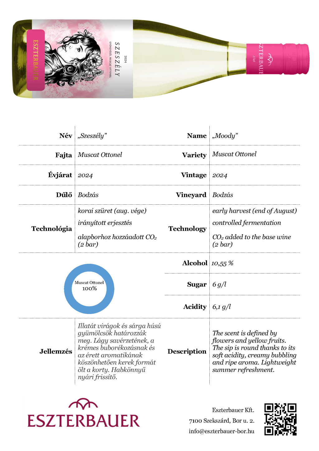• „Szeszély” 2024 Muscat Ottonel: Ez a gyöngyöző bor friss, virágos aromáival és édes ízével tökéletes aperitif, amely felcsigázza az ízlelőbimbókat, és jól illik a könnyű előételekhez.