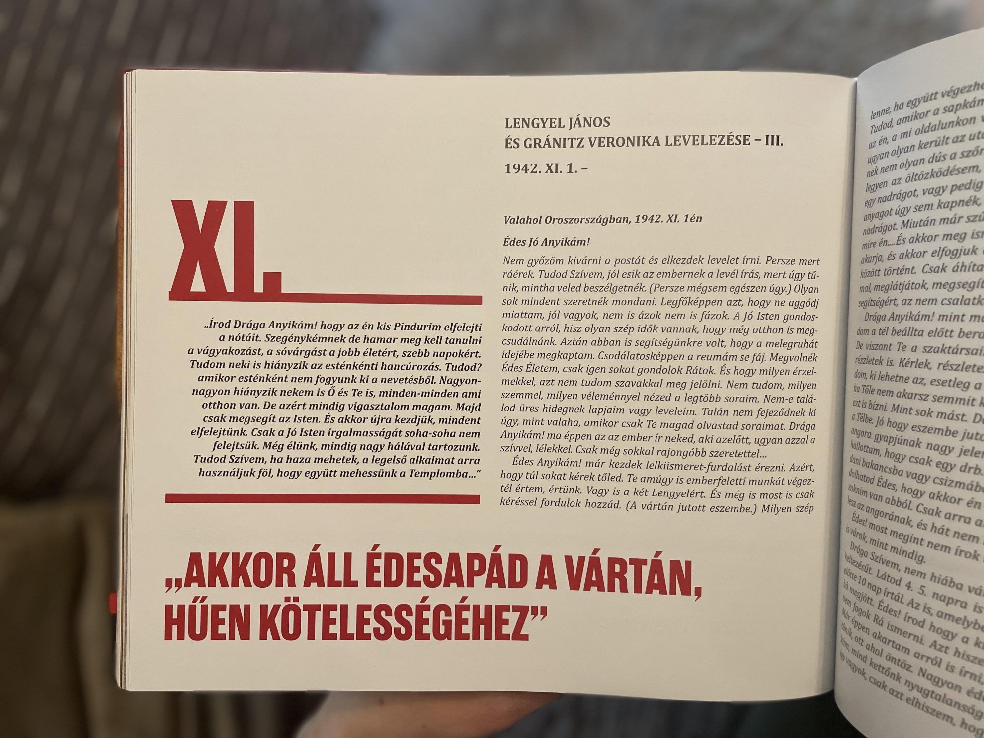 November végén aztán mégiscsak felcsillant a remény, hogy János karácsonyra szabadságot kap. „Édes Szívem! Azt írod ne írjam, hogy nem megyek haza, vagy hiába írom, hogy nem megyek Te azért csak vársz. Édes! Tudod, hogy ezután nem azért nem írom mert Te írod, hogy ne írjam. Ezután azt írom, hogy megyek Szívem szabadságra, míg el nem indulok, minden lapomba lesz róla egy két szó. Azért mert eddig úgy van, hogy dec. elején rám is kerül a sor, hacsak nem csinálok valami ballépést. Tudod, hogy emberekkel van dolgom, és nem tudja az ember, hogy hol lép, vagy lépnek félre. Én mindig azt mondtam, majd a jó Isten nem hagy el. Édes, Téged is arra kérlek, csak ne aggódj, mert az Isten sokkal jobban is megverhet, az a fontos, hogy jól vagyok, és neked türelmesen kell várni és imádkozni. (…) Mert ha Isten velem, akkor nem kell semmi féle veszedelemtől félni.”